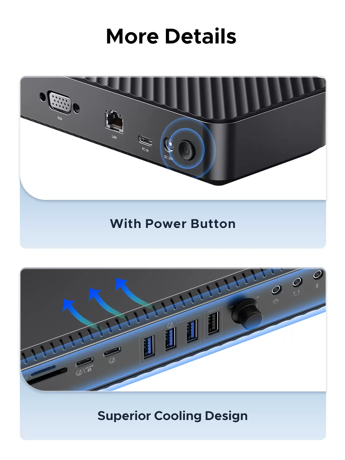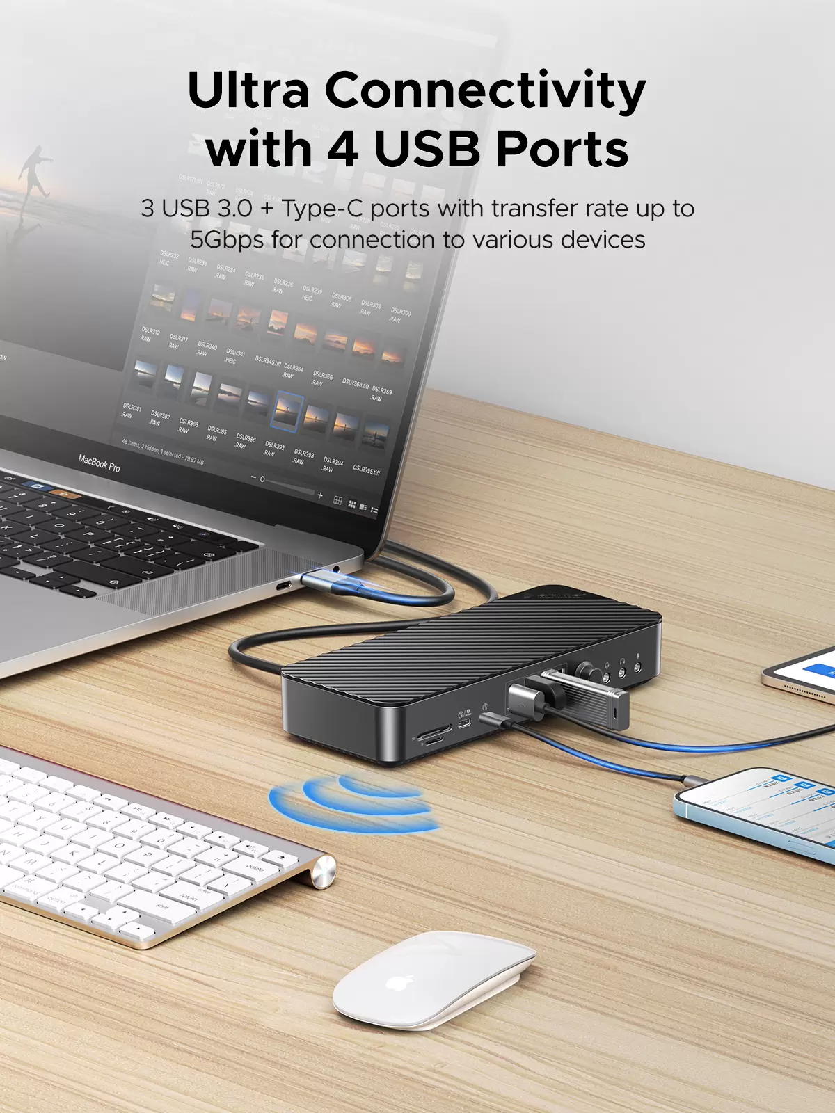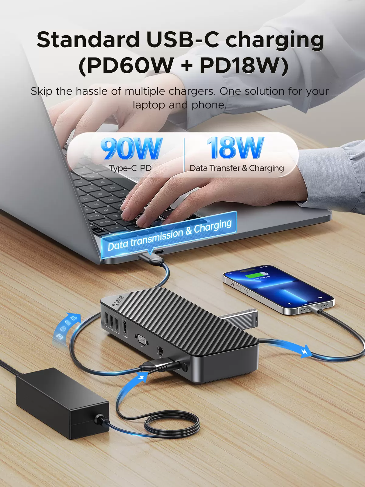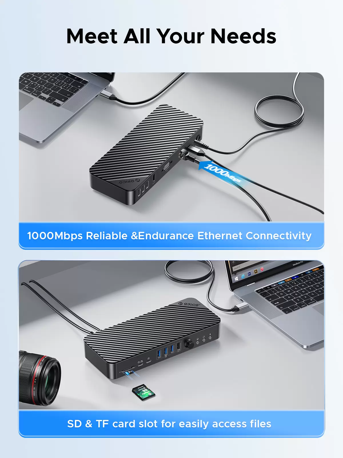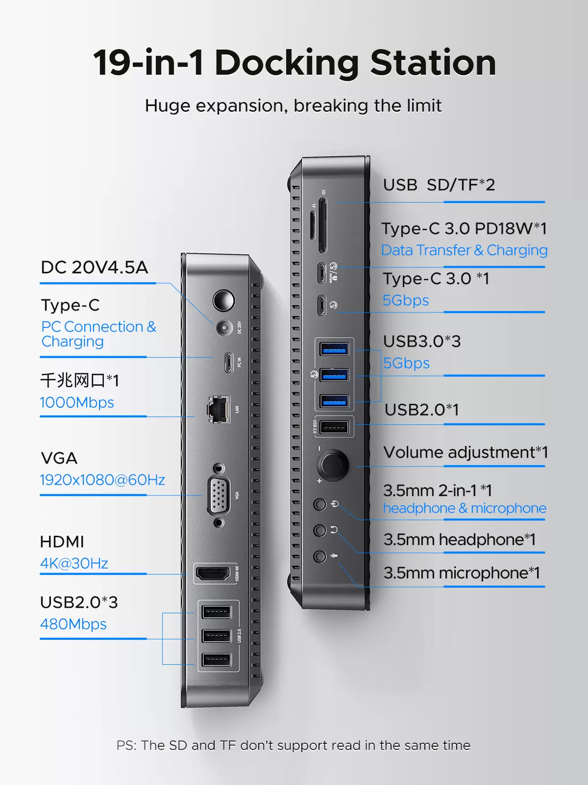USB-C PD60W*1, USB-C 3.0 PD18W*1, USB-C 3.0 *1, USB-A 2.0*4, USB-A 3.0*3, RJ45 Interface*1, USB 2.0 SD/TF*2 (Not Simultaneous), 3.5mm Headset Jack*1, 3.5mm Mic Jack*1, 3.5mm Mic/Headset Jack*1, HDMI 4K@30Hz*1, VGA 1920x1080@60Hz*1, Volume Adjustment Knob*1